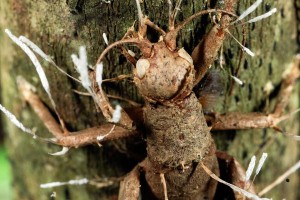 that open and close their jaws fall off. This results in a ‘lock jaw’, which means that an infected ant is unable to release the sheet after death. A few days later, the fungus produces a fruiting body (stroma) of the ant’s head which releases spores to be