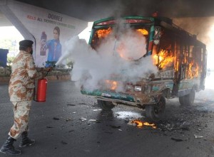The angry demonstrators, protesting to end violence in the city, set two cars and three motor cycles on fire in the Teen Hatti area. Moreover, a passenger bus was also burnt at Nishtar Road.
